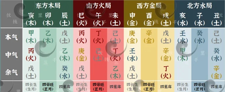 注意,顺序一定不能打乱,因为这是按“人元司令分野”排列的。 从“人元司令分野”可以看出,地支藏干是有规律的,原则上,分余气、中气、本气。“余气”乃上一支的“本气”五行的延伸,如“丑”之“余气”癸水,乃上一支“子”的本气的延伸;“中气”乃该支三合合化之五行,如“丑”的中气为“巳、酉、丑”三合化出的五行—辛(金);“本气”乃该支相同之五行,如“丑”的五行属土,所以“本气”为“己”。
