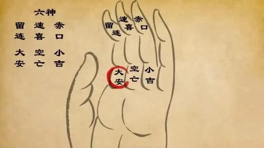 ⼤安:位于⾷指底部,即⼗⼆地⽀掌“寅”所处的位置。